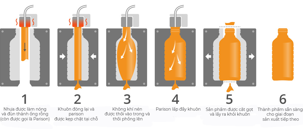 Quá trình thổi nhựa bắt đầu khi vật liệu nhựa được chảy vào khuôn thổi nhựa. Khuôn thổi nhựa được thiết kế với một đường ống đưa nhựa vào và một lỗ thổi phía bên trong để thổi khuôn nhựa thành hình dạng mong muốn. Khi nhựa đủ cứng để loại bỏ khỏi khuôn thổi nhựa, sản phẩm sẽ được tách ra.